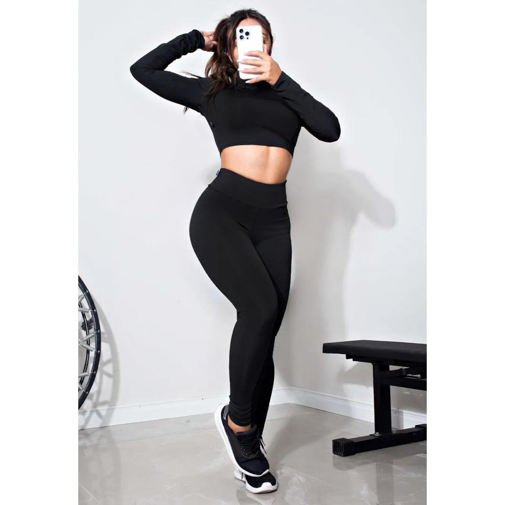 Conjunto Fitness Fitness Cropped Manga Longa e Calça Legging Preto conjuntos