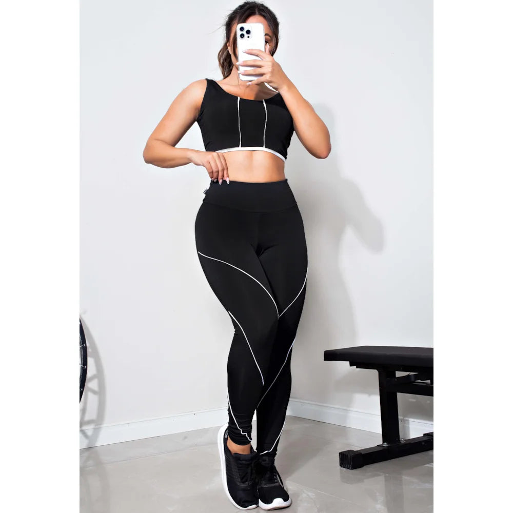 Calça Legging Fitness Academia Preta com Detalhe Lateral em Vivo Branco Cintura Alta