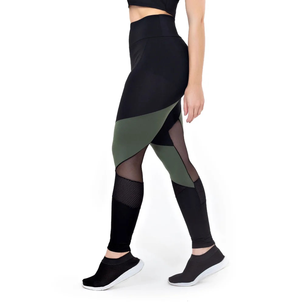 Calça Legging Cintura Alta Assimétrica com Detalhe em Tulê e Tela Preto com Verde Militar calcas-fitness
